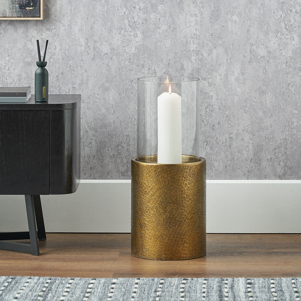 Create a relaxing atmosphere and add a touch of style to your home with our antique brass metal hurricane. Handcrafted in India, the hurricane will look stunning with a large pillar candle enclosed in the sleek, clear glass surround.