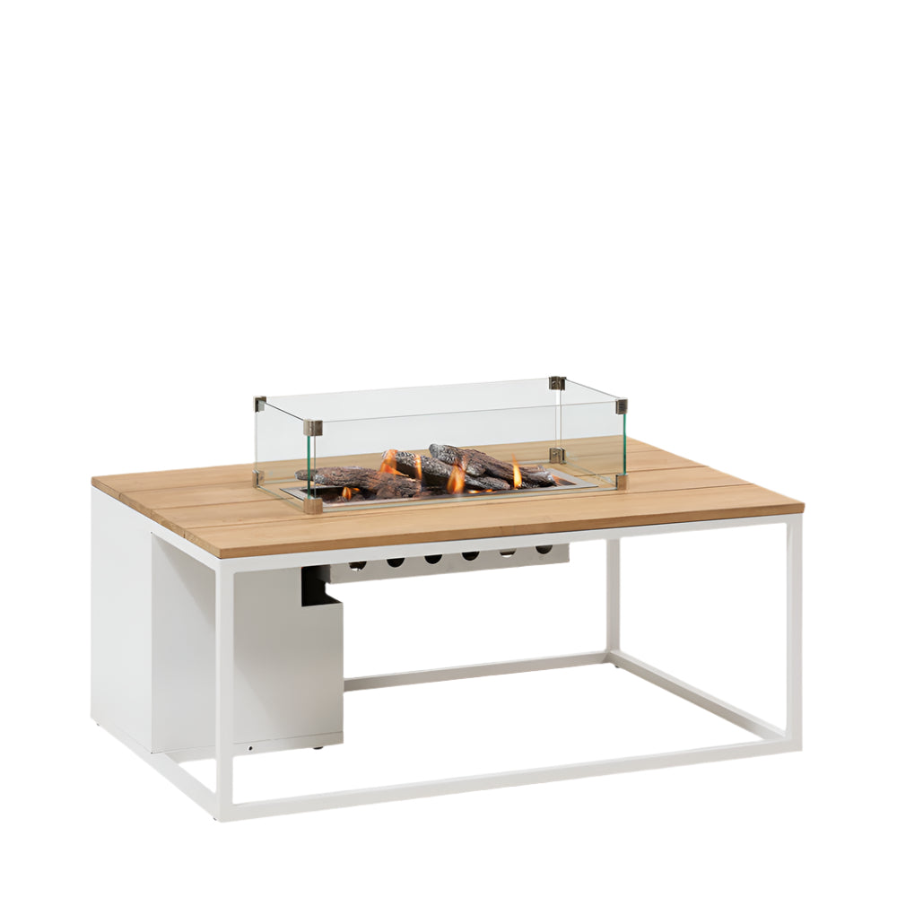 The Cosiloft 120 White and Teak Fire Pit Table features an openwork aluminium frame, combined with a Teak wood top for a modern natural look, making this table stylish and easy care. The rectangle shape means there is ample room for entertaining, it fits a 5kg propane gas bottle which is hidden away from view in a compartment under the table and doubles up as a contemporary design feature. The 5kg propane gas bottle can be purchased from all good gas retailers. Why propane gas? A conscious decision was made to make the fire pits only work on propane gas, and not on natural gas. Propane is one of the cleanest fuels in terms of CO2 emission and is a by-product of both the extraction of natural gas and the refining of crude oil. The Cosiloft Firepit Table is delivered including a 30 mBar regulator with gas hose, 4 ceramic logs, lava stones and a battery to power the ignition. The Cosiloft also comes with a metal plate to cover the firepit burner with the logs and lava stones removed so that it can be used as a full coffee table. Choosing a Cosiloft with Teak Top? If you choose to cover your teak table with one of our weather protection covers, please remove it every so often to allow the wood to breathe. Alternatively, you can leave the teak tabletop outside or store it inside. If left outside the teak will age naturally and beautifully when left to the elements. Features Aluminium base and top Works with a 5KG propane gas bottle (not included) Hidden compartment for the propane gas bottle Electronic Ignition that works with a battery (included) 30 mBar regulator with gas hose 4 ceramic logs (included) Lava Stones (included) Easy Care Optional Extras 18-525 Cosi Straight Glass Set (to protect the flames from the wind - recommended) 18-516-OB Cosi Cover Plate Oblong for Straight Glass Set (to sit on top of the glass surround when the fire is not in use) 18-520-C Cosiloft 120 Lounge All Weather Protection Cover (to protect the whole firepit when not in use) 18-534 Ceramic Wood Effect Logs 4 Pieces Please see the recommended maintenance in our Outdoor Product Care Instructions