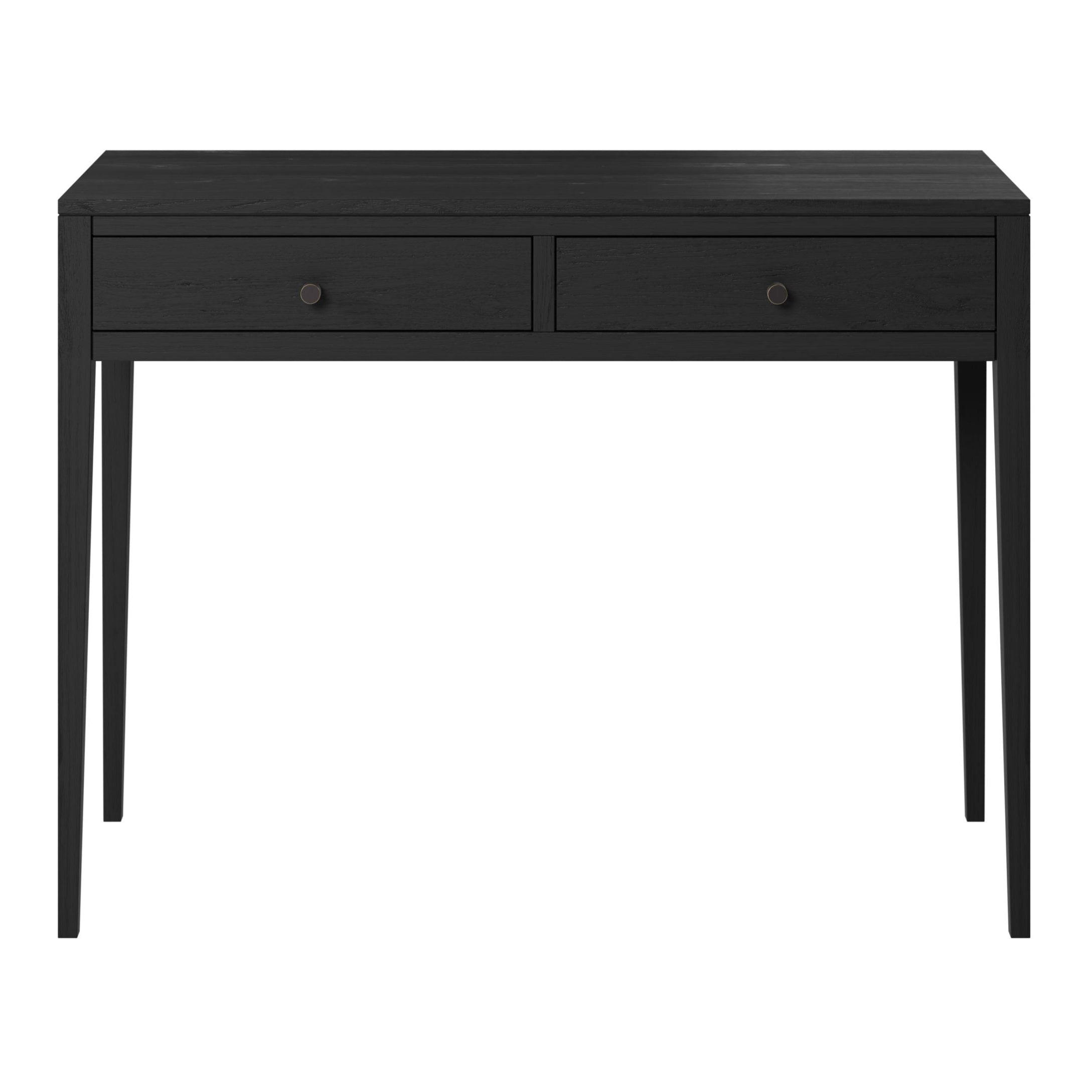 This Hartley Black Console Table will instantly elevate the look of any room with its sophisticated style. Crafted from solid oak and oak veneer, it boasts classic details such as tapered legs, visible grain, round handles and drawers on metal runners. An elegant solution for any space.