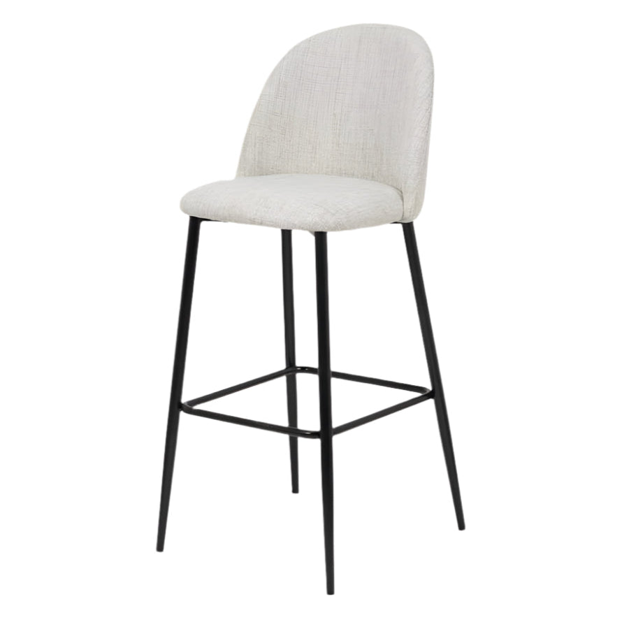 Upgrade your home with our contemporary Turi Bar Stool. The simple curved back and sleek black metal legs add a touch of sophistication to any space. Crafted from a pebble linen mix upholstery, our bar stool provides both comfort and modern style. Perfect for any breakfast bar or kitchen island.