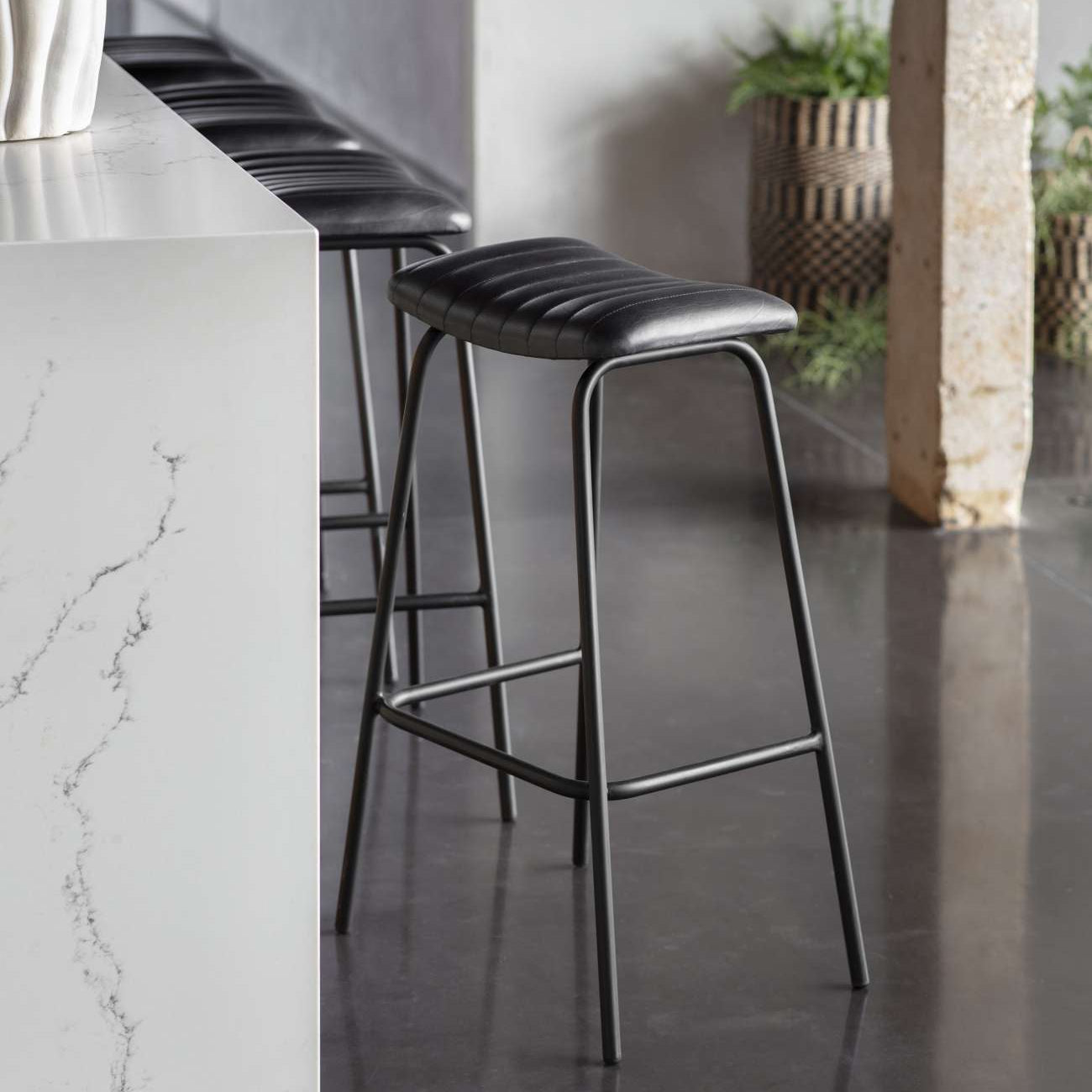 Experience luxury and sophistication with our Arthur Leather Bar Stools, in cognac and black charcoal colors. These stools feature sleek parallel stitching and a comfortable foot rest, perfect for elevating your home bar or kitchen counter.