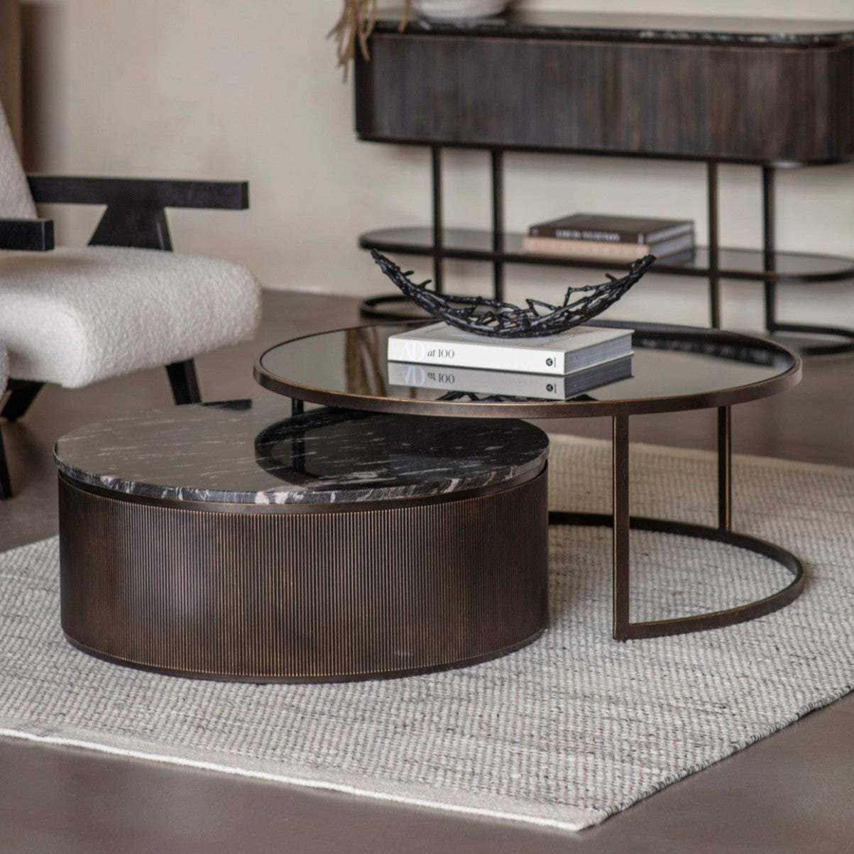 The Belvedere Aged Black Set of Two Nesting Coffee Tables embodies contemporary, space-saving design at its finest. These stunning tables feature smooth gilded dark bronze frames, black tinted glass, and beautiful Markino Marble. The natural materials used ensure that each piece is unique and gold is used in highlights to contrast against the black tones. Marble tops will feature individual veining patterns and varied colour hues, while the iron bases may have slight texture variations. These characteristics enhance the charm and individuality of your furniture, guaranteeing that no two products are exactly alike. The Belvedere Aged Black range also includes a side table and a console. Additionally, a larger collection is available in Aged Gold.