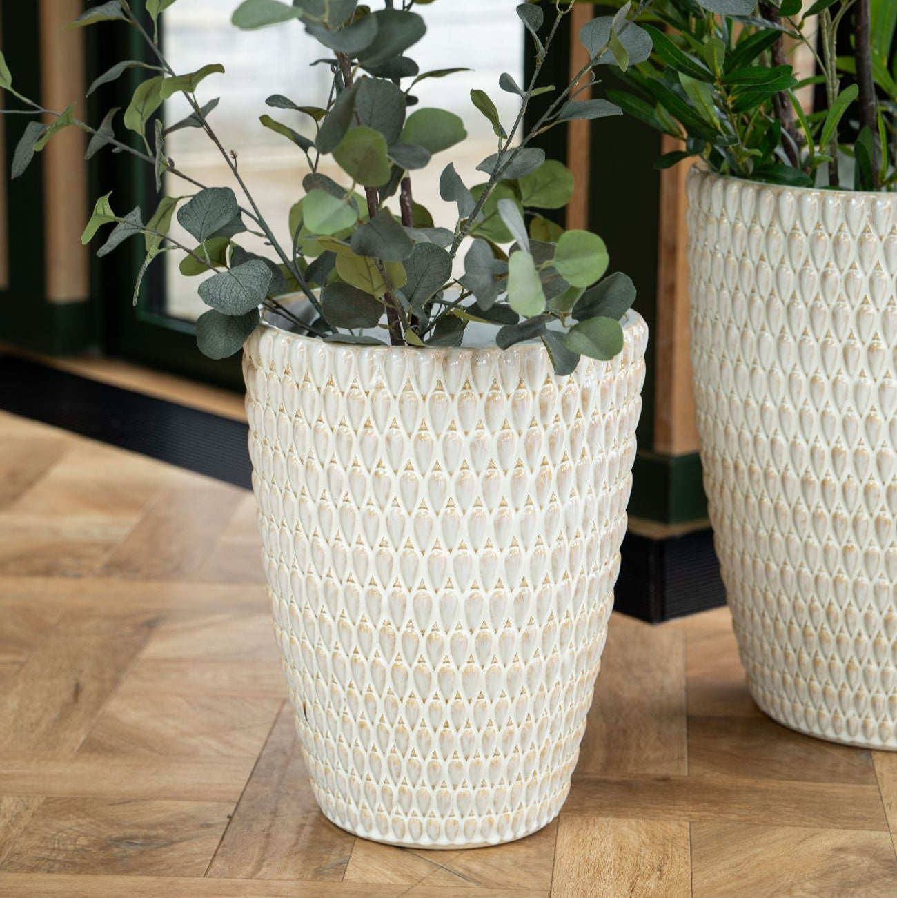 Introducing our Mediterranean Reactive Glaze Ceramic Planter in Cream. Elevate your indoor sanctuary with this lavish masterpiece exuding sophistication and charm. Meticulously designed, it boasts a mesmerising textured reactive glaze.