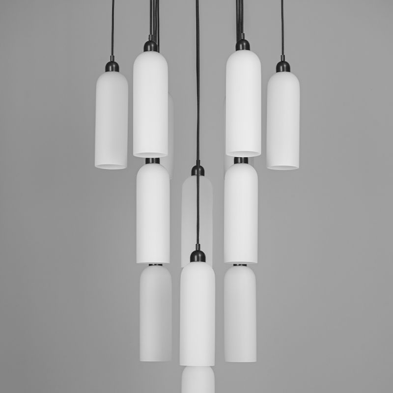 A gleaming constellation of thirteen opal glass arches strikes the eye with their sleek arrangement and brass accents. This design is a study in rhythm, the repeated forms make a melodious choir transporting us with their glowing voices.