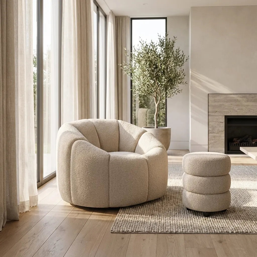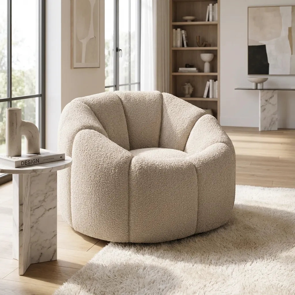 The Nao chair features buff boucle fabric and a swivel base, offering a stylish yet relaxed lounging experience. Padded for extra comfort, its 70's inspired design adds a retro touch to any space.