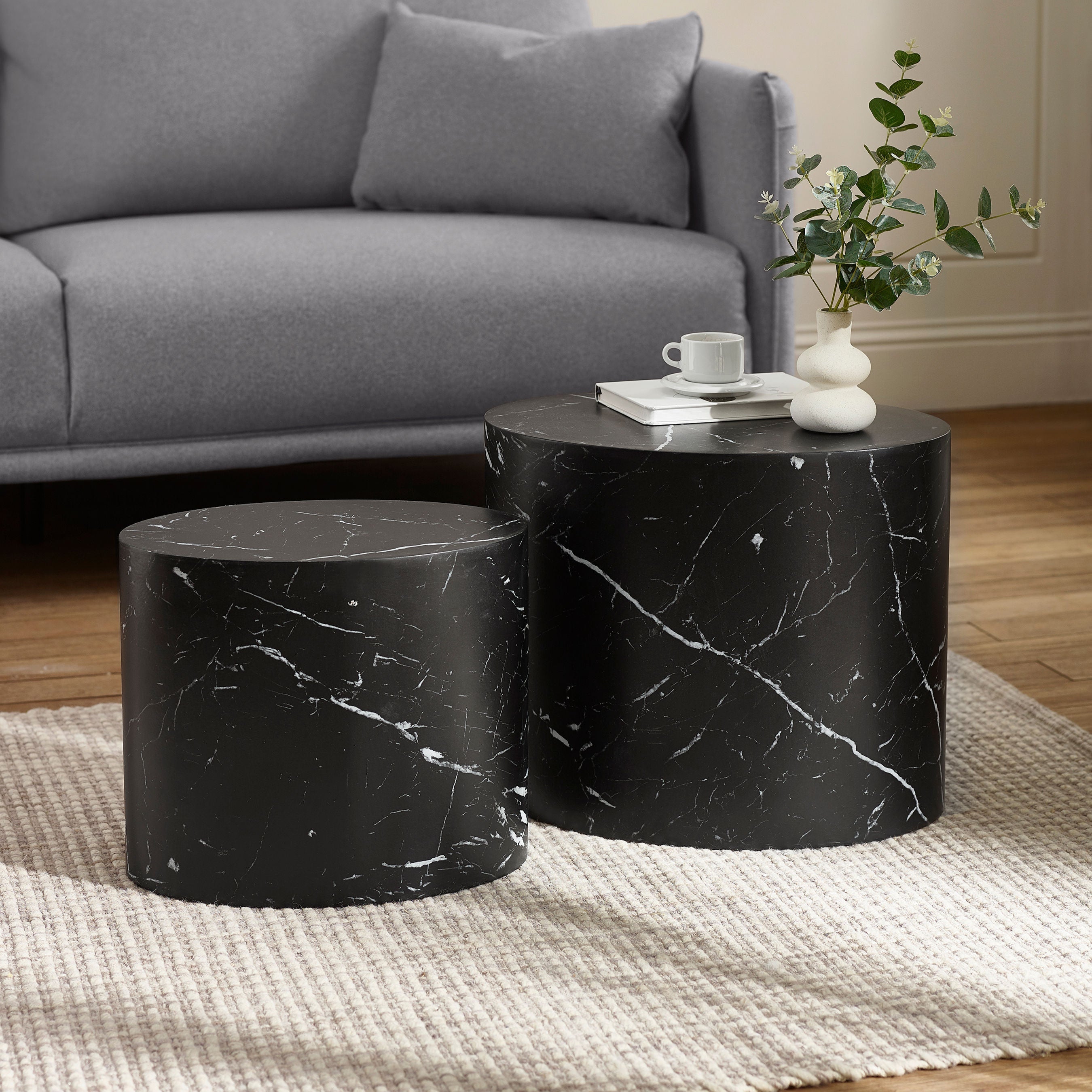 Bring bold elegance and sculptural style to your living space with this black faux marble nest of tables. Featuring sleek oval tops with a polished, sophisticated appearance, they effortlessly blend striking design with practical elegance. Their smooth curved silhouette creates the perfect spot for drinks, books, or your favourite décor. The stacking tables design makes it easy to save space when they’re not in use. Ideal for cosy apartments or minimalist interiors, they offer versatility and sophistication with no assembly needed.