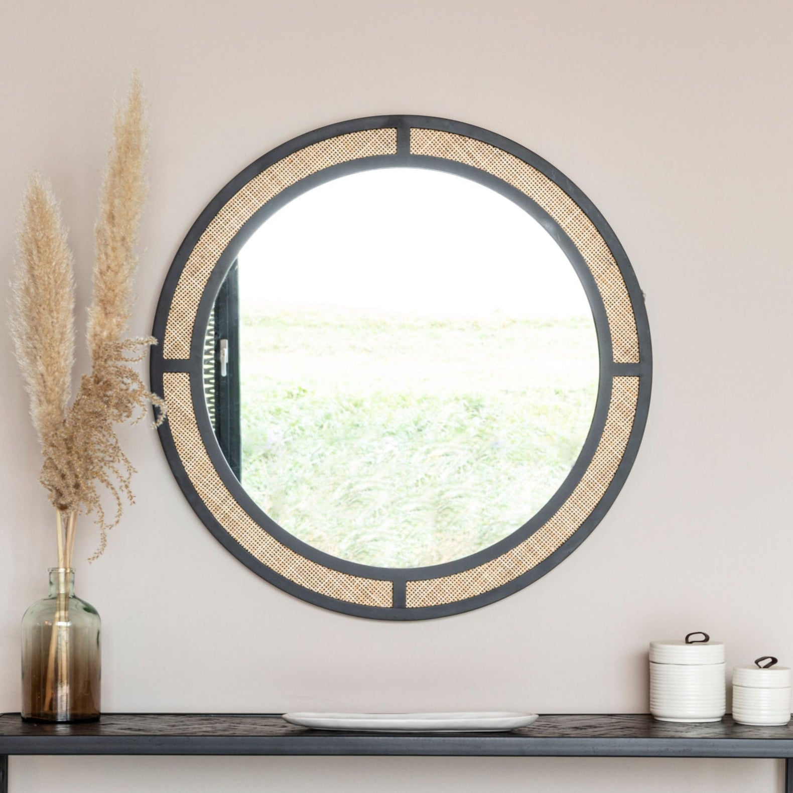 Aida Black Wood & Natural Rattan Round Wall Mirror