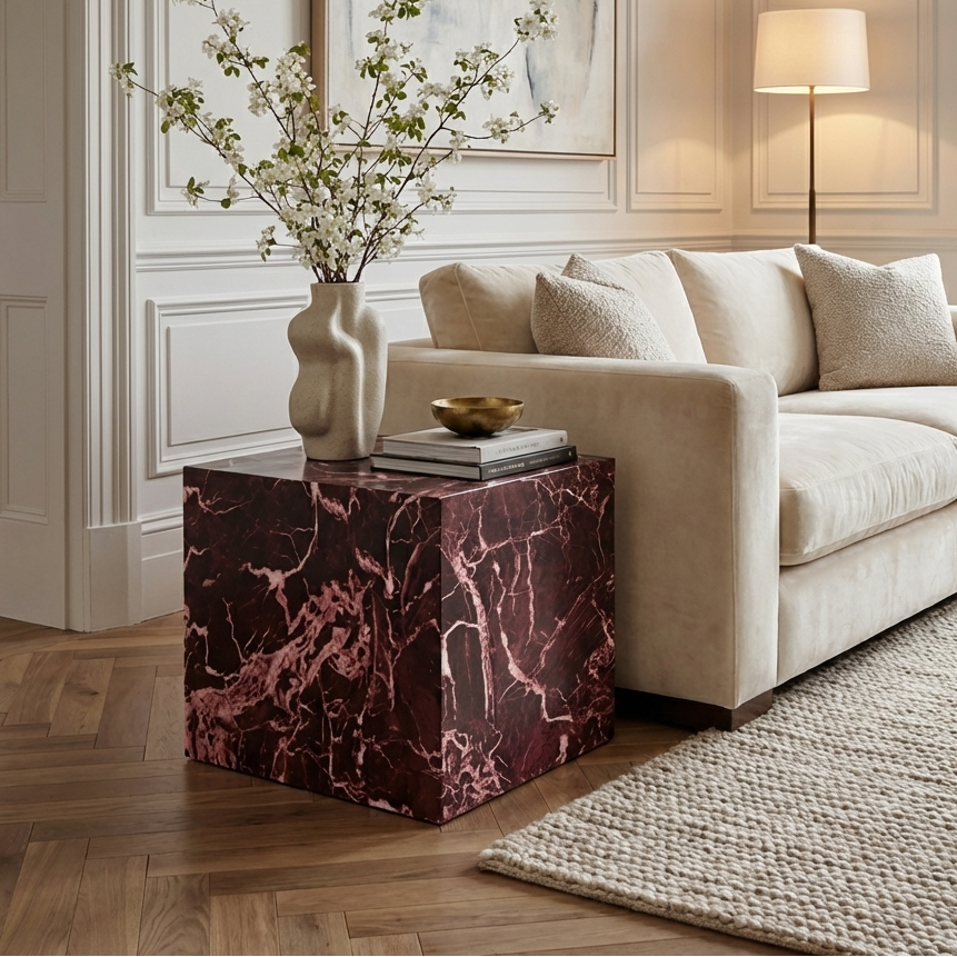 The Sur side table showcases a rich Rosso Levanto marble-effect finish paired with a minimal, modern silhouette. Its on-trend colour and design-forward style make it a striking accent piece that effortlessly elevates any interior.