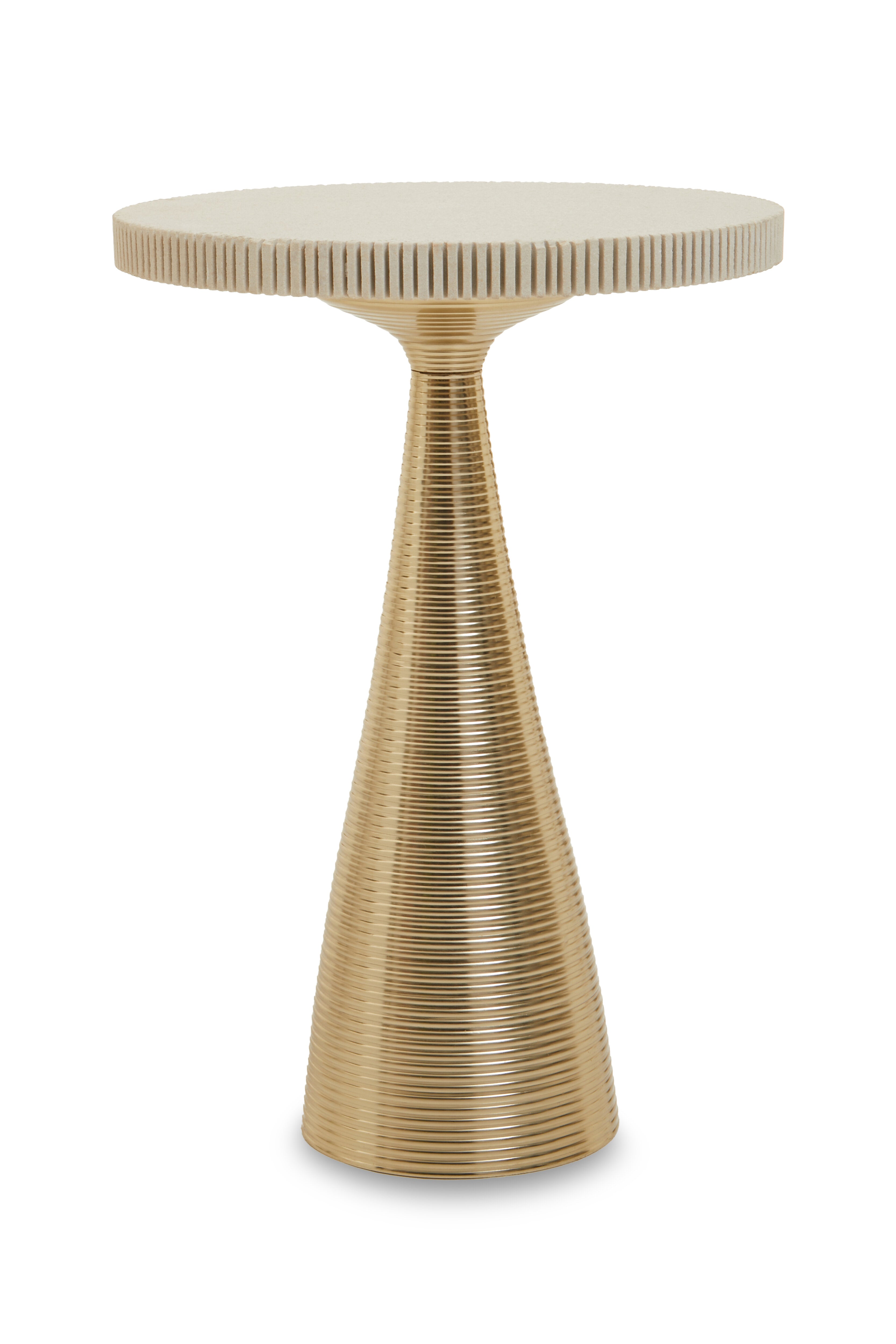 This side table has a tapering cylindrical base featuring a gold finish with horizontal lines running across it that add to its shine. This is counterpointed by the muted round stone top with depressions across its side adding to the style.
