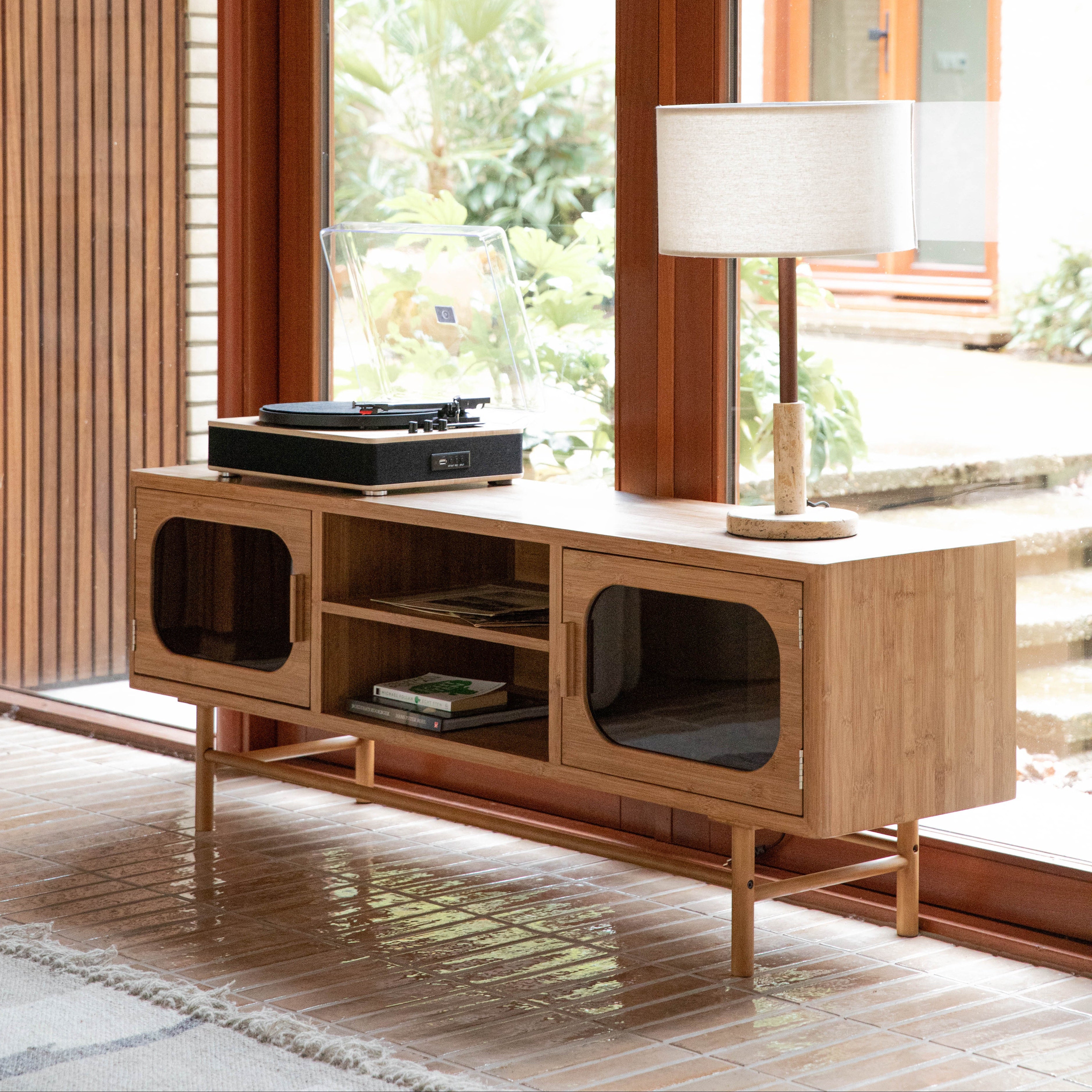 With the Dutchbone Caroun collection, turn your home into a cosy place to gather with loved ones or enjoy your free time with a good book. This carbonised bamboo furniture instantly radiates warmth due to the natural material. The warm look of these cabinets, mirrors and table is further enhanced by the rounded shapes and rounded corners that recur in all the furniture in the collection. In addition, the smoked glass in the drawers and doors of the cabinets is a nod to the 1970s, giving the furniture a subtle retro touch.