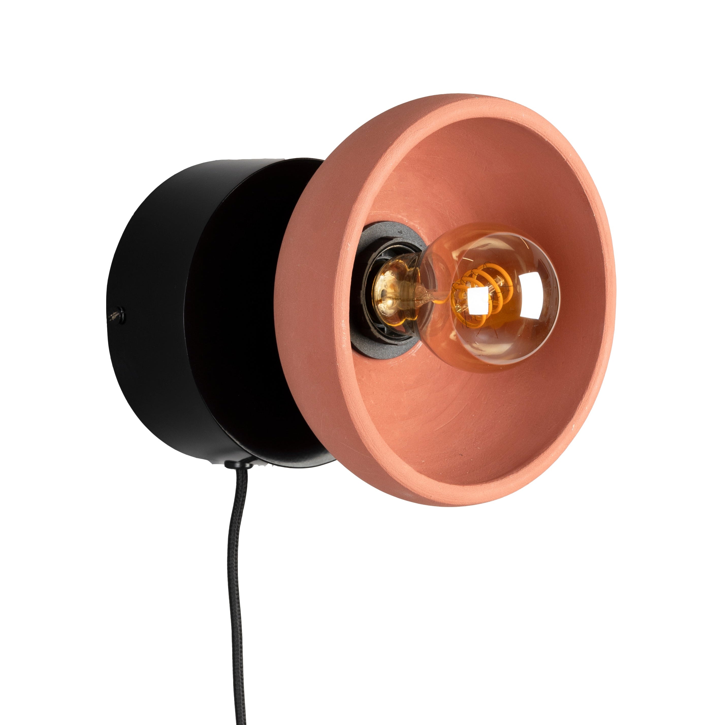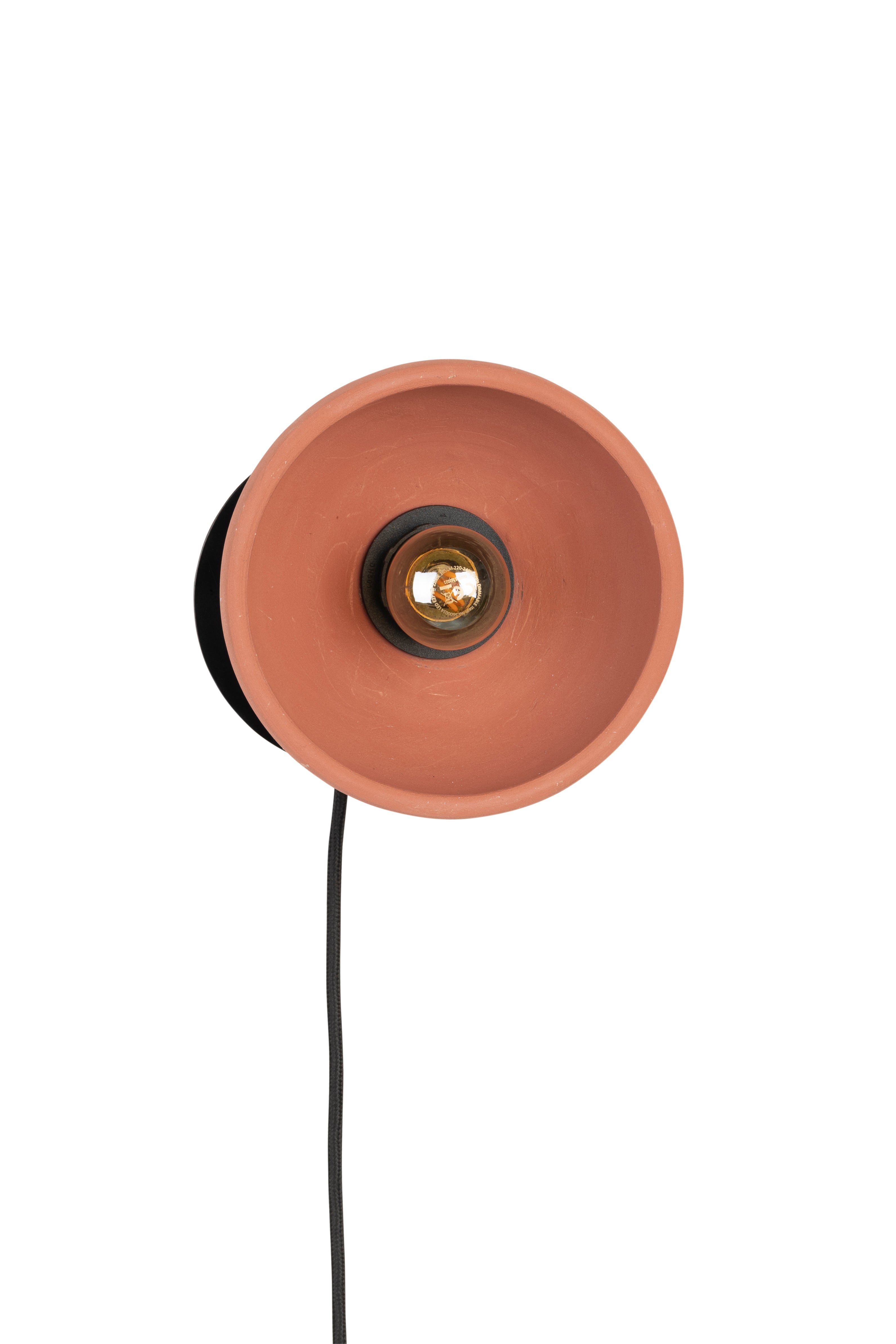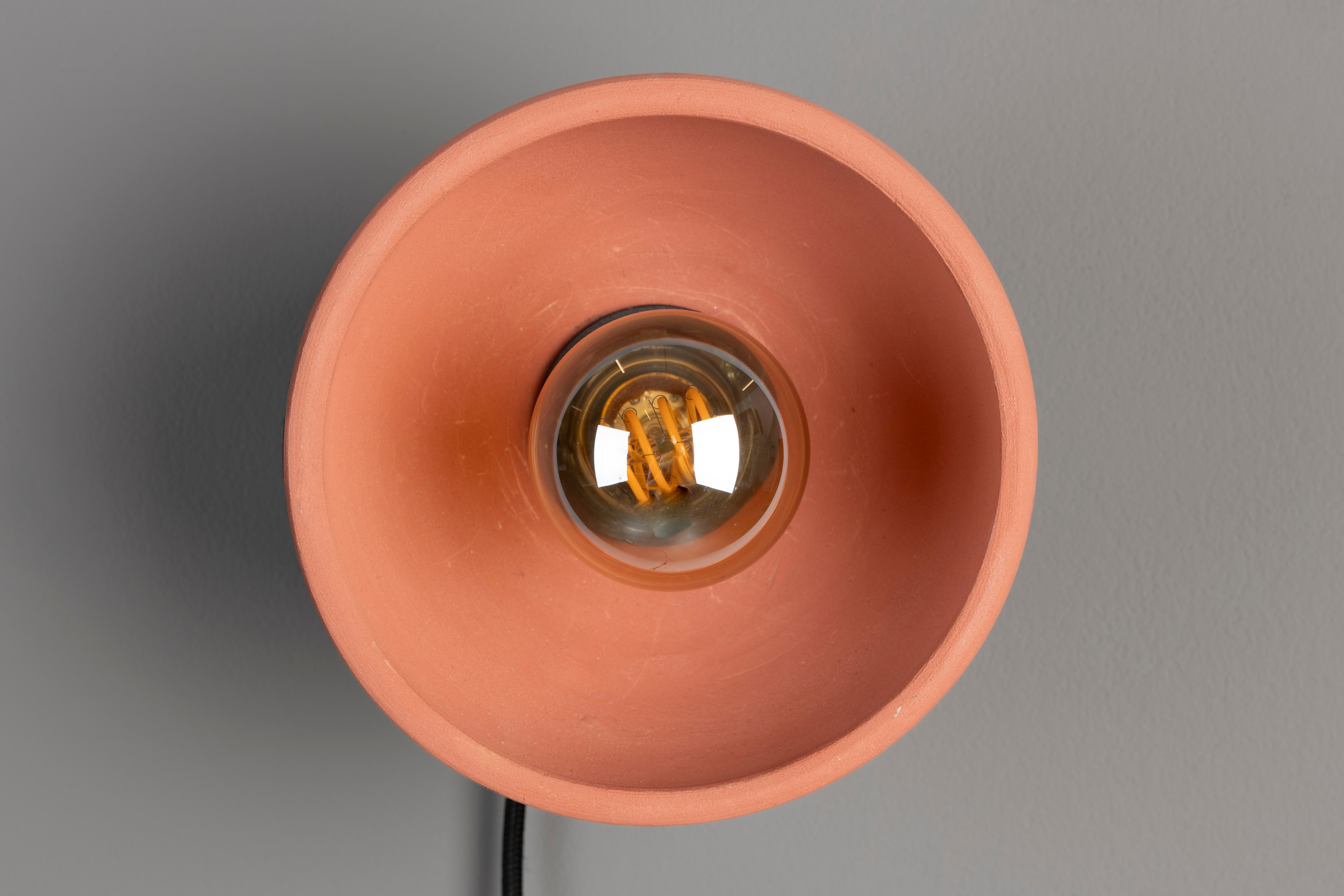 Has a round, terracotta lampshade
