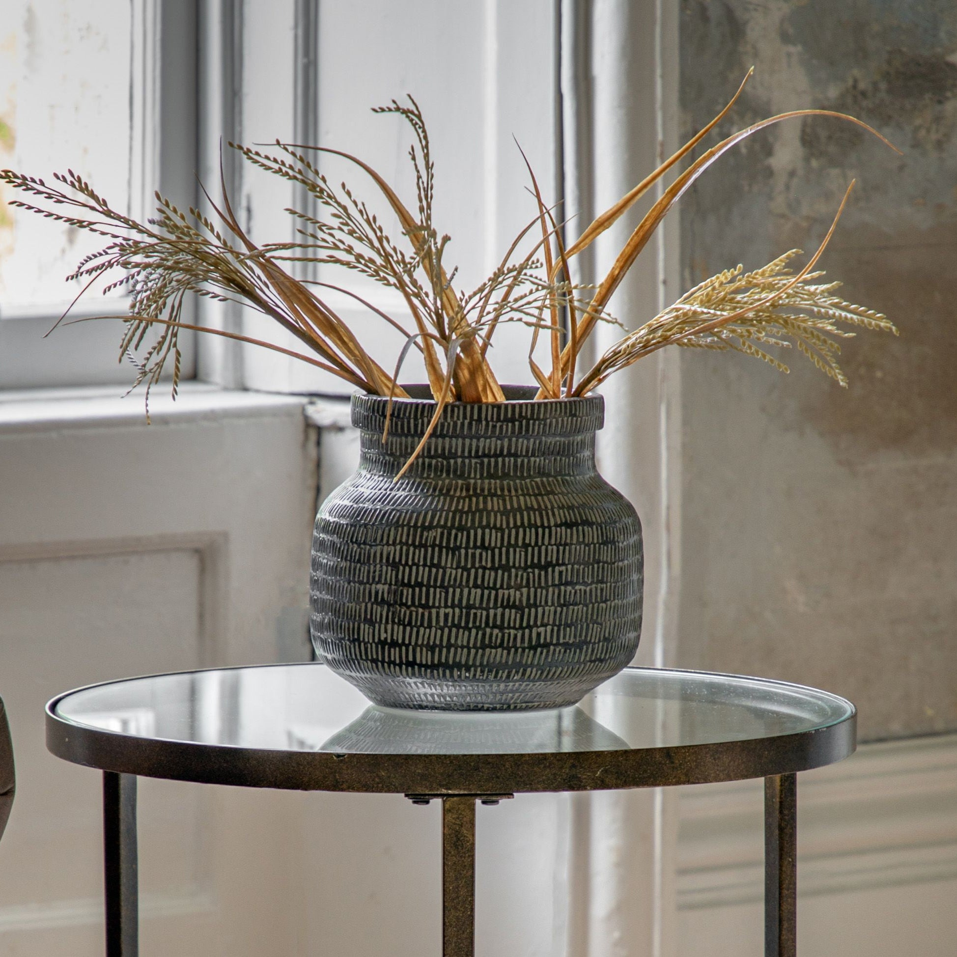 Handmade with a textured design scratched into the rich black ceramic glaze, this wide vase has intriguing depth, bringing a modern handmade style to your home. Looks great paired with the coordinating pieces in the collection.