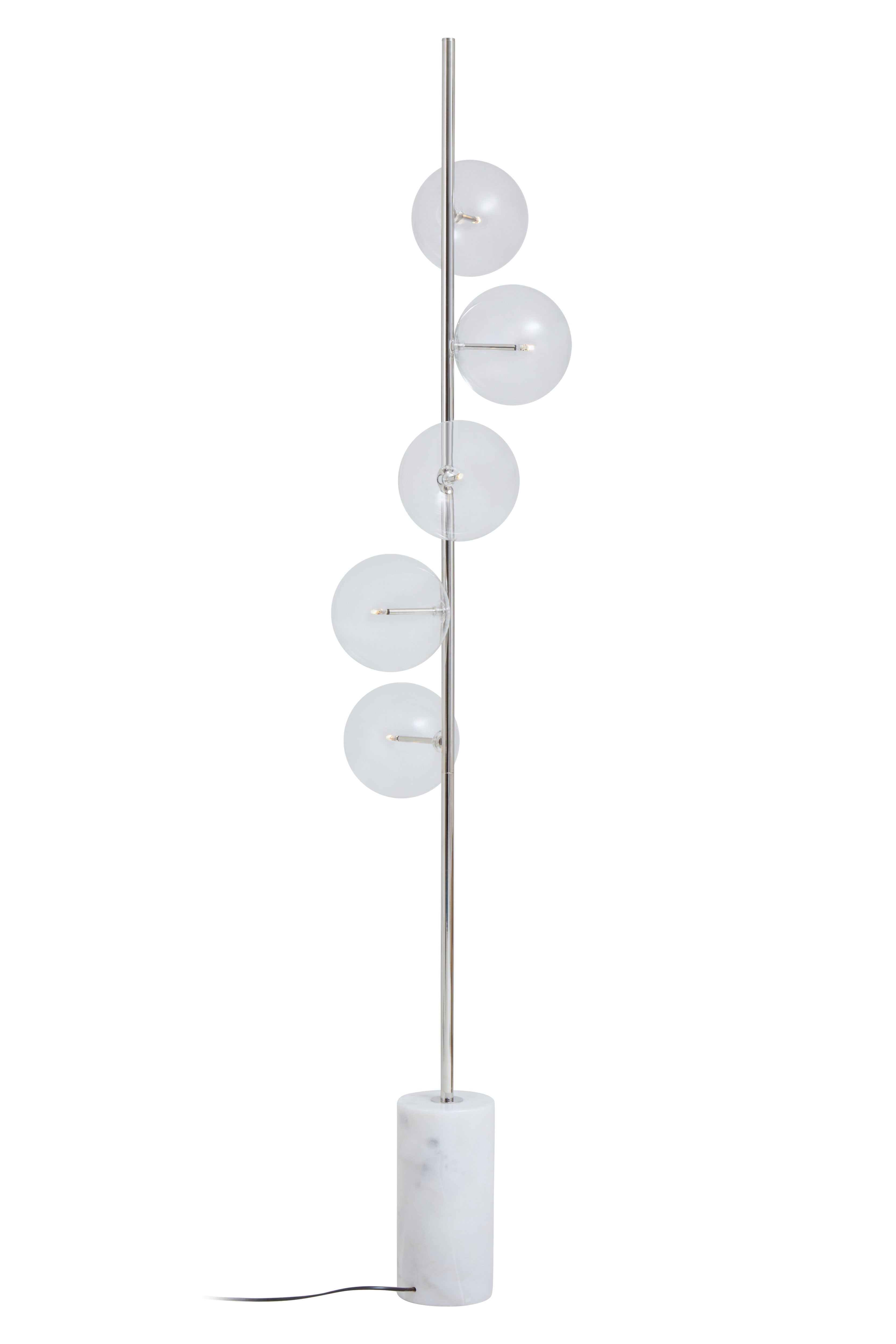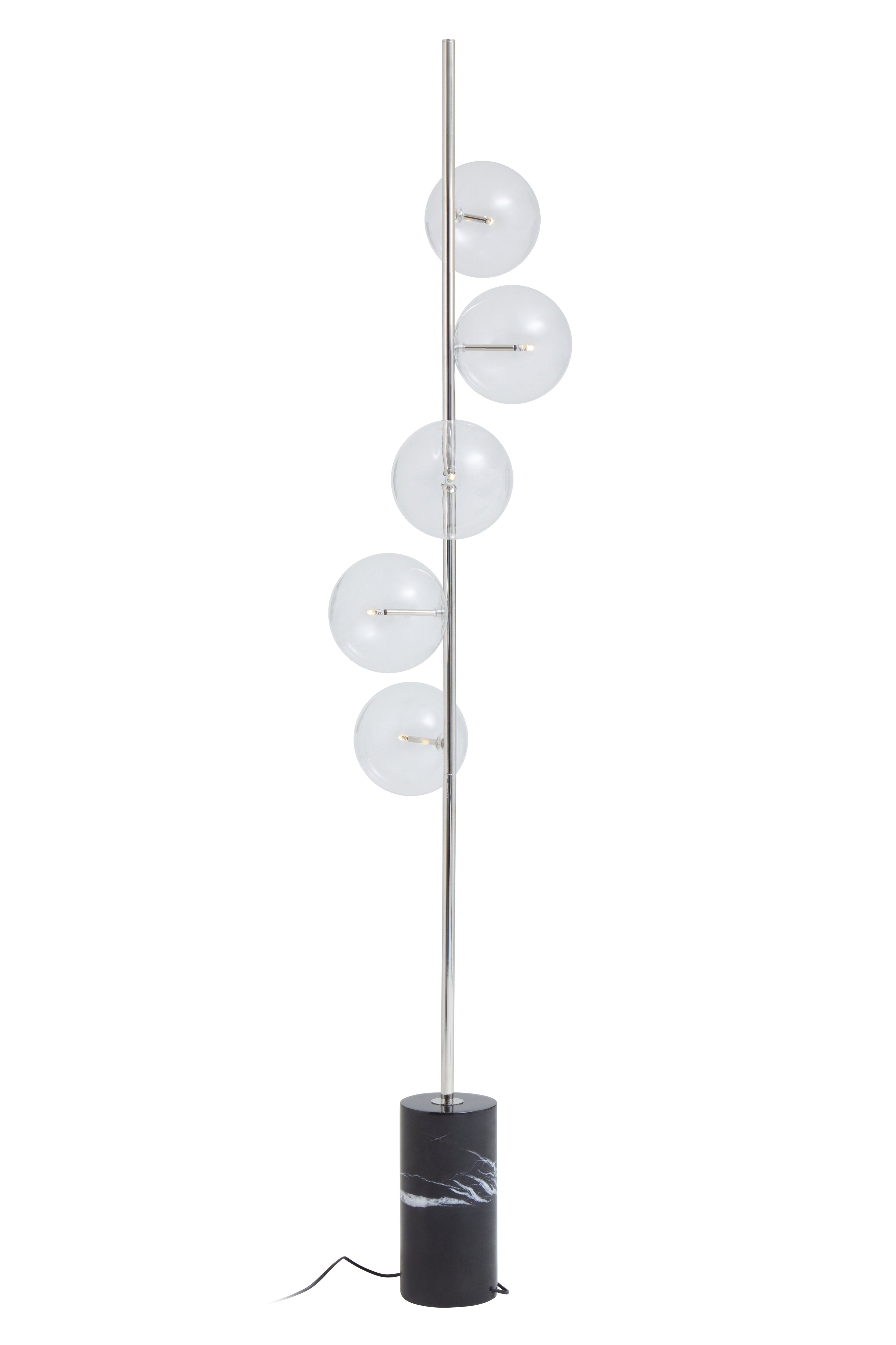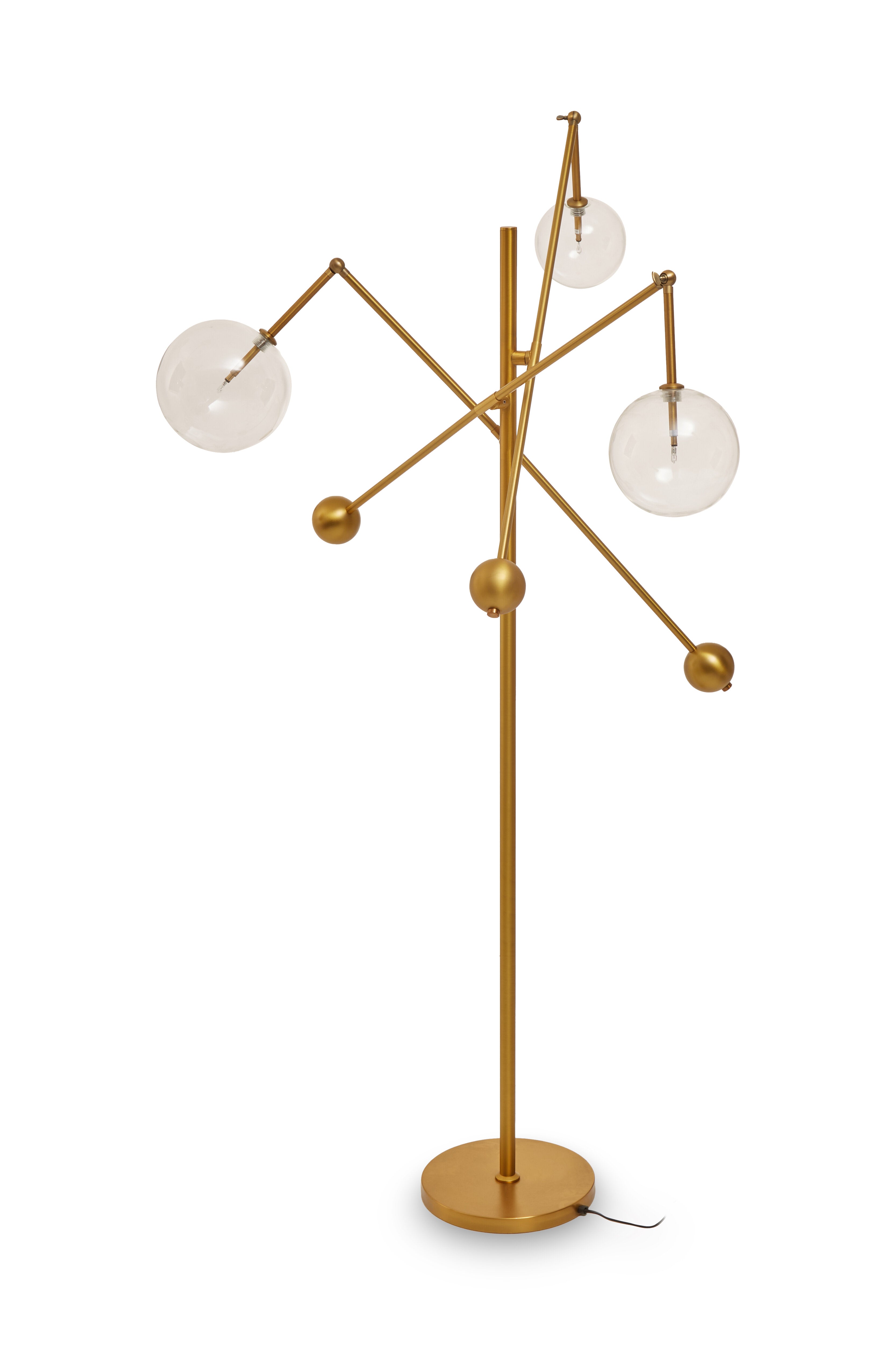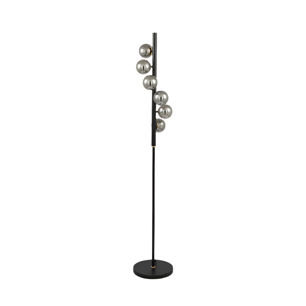 A sophisticated floor lamp with 6 smoke glass balls, black post and brass coloured detailing creating a chic, futuristic look. Create a statement with this stunning floor lamp. Pair with a matching table lamp and pendant style if needed.