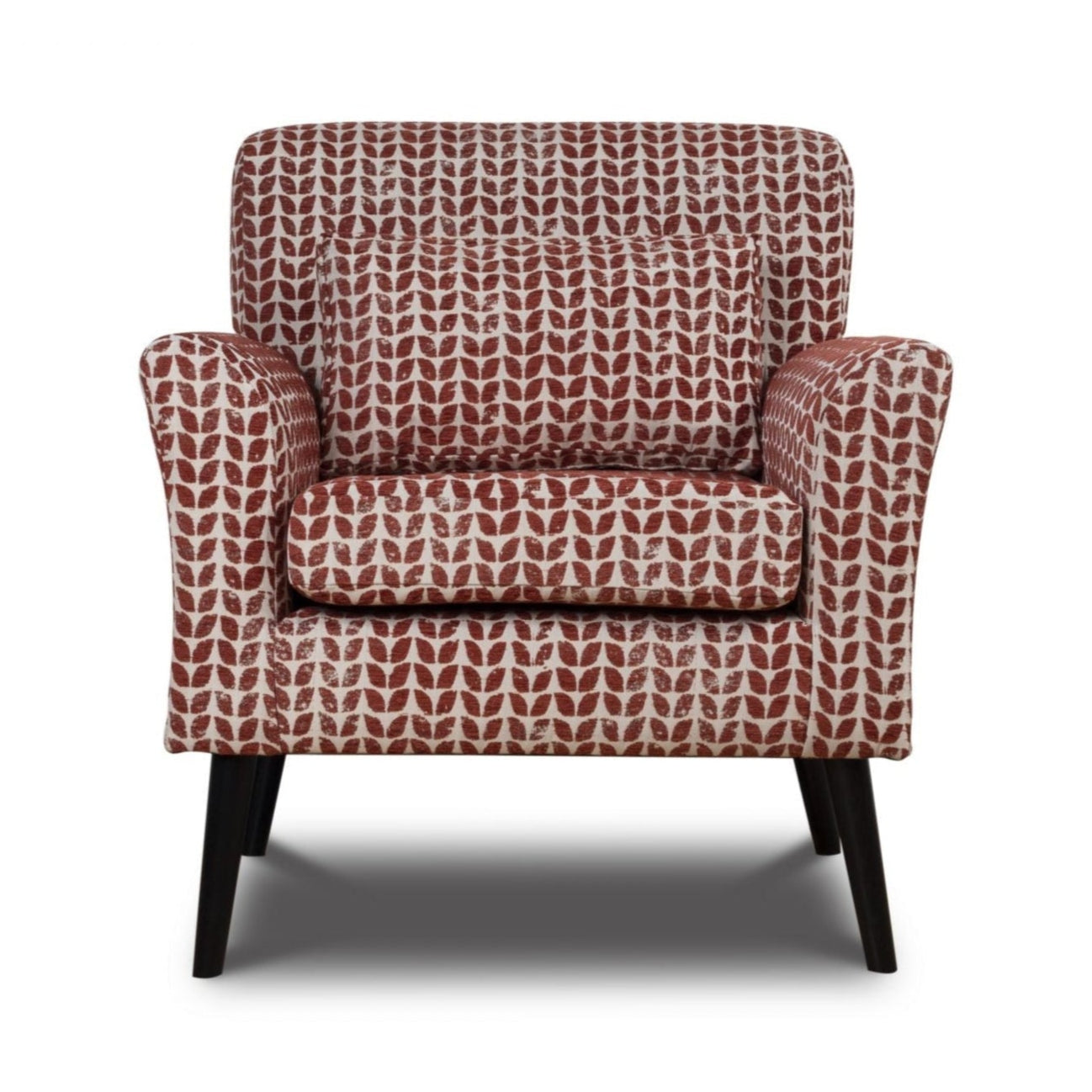 Warnborough club chair in red patterned fabric, birch frame, legs painted black, cushion, polyurethane foam & hollow blown fibre filling. Made in the UK.
