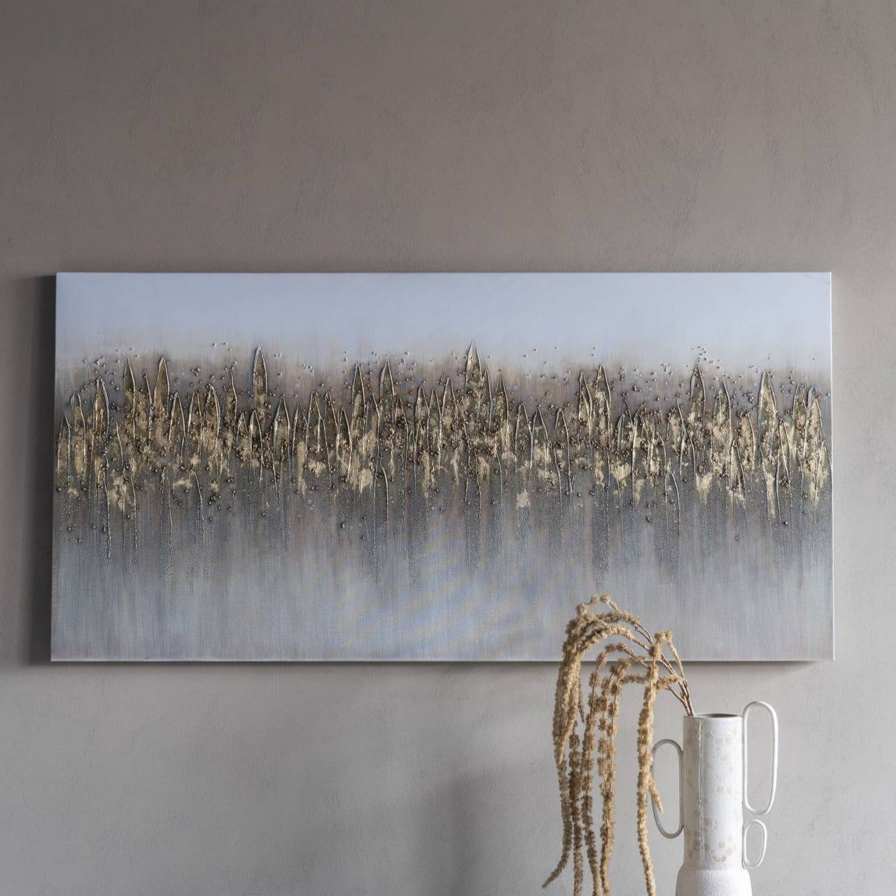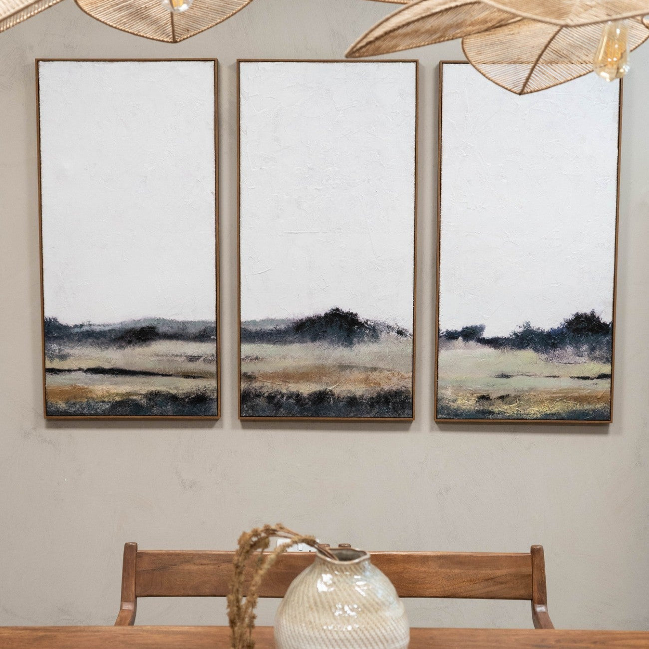 Set of 3 Green Fields Landscape Wall Art is a three-panel artwork crafted on jute canvas, each capturing the calm beauty of expansive fields under a serene, textured sky. The natural jute material enhances the rustic charm, while the heavy brushstrokes and layered finish bring depth and dimension, making it a striking addition to any space. Perfect for modern or classic interiors, the neutral tones evoke a sense of tranquillity and timeless style. Each panel measures 60cm W x 120cm H and is mounted on a premium frame, ready to transform your wall.