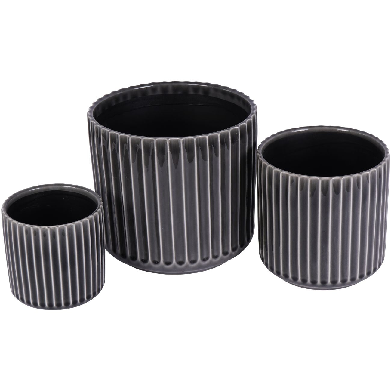 Introducing our Medini Reactive Glaze Ceramic Planters Set of Three—a pinnacle of sophistication. Each planter features a mesmerising ribbed effect and finished in a striking black hue. Unsuitable for outdoor use.