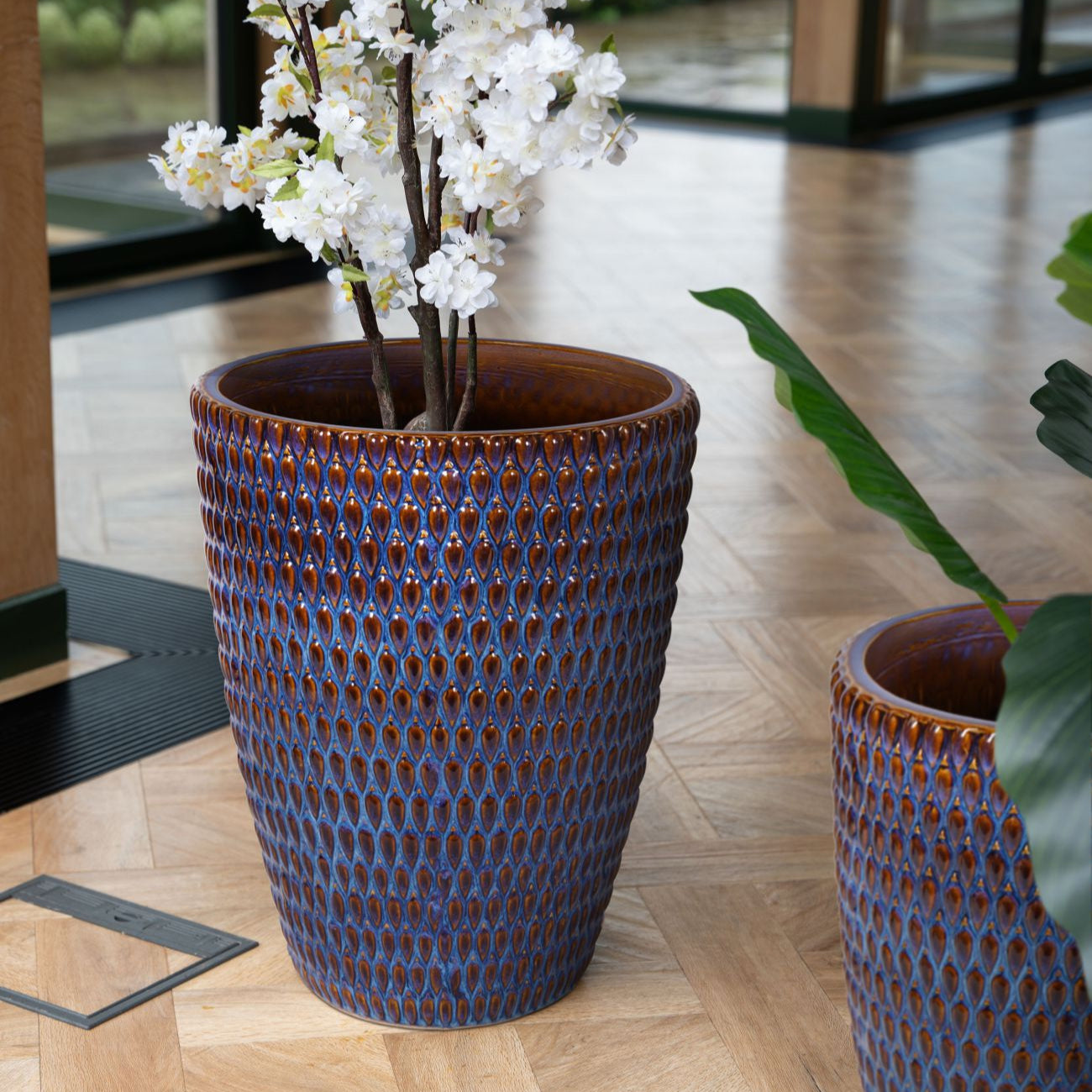 Introducing our Mediterranean Reactive Glaze Ceramic Planter XL in Blue. Elevate your indoor space with this captivating piece, featuring a reactive glaze reflecting azure blues, earthy browns, and subtle bronze hues. Designed with an exquisite raised teardrop surface, each curve embodies refined elegance. Perfect for showcasing botanical treasures, adding serenity to any interior. Indoor use only. Explore our full Mediterranean collection, including five additional Planters, three Ginger Jars, and three decorative Bowls.