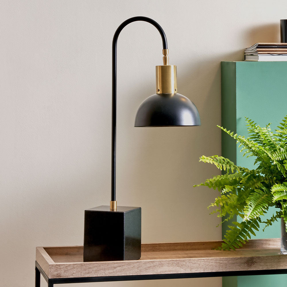 This task table lamp is the epitome of style. The sleek Mayfair table lamp with its black marble base is finished in matt black and brushed brass metal with a domed, moveable shade so that you can pin point the light source to where you need it the most. This stylish table lamp will look fabulous on your desk, or a side table to illuminate the corner of your room. A matching wall light is also available.