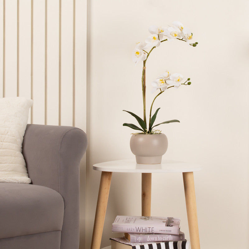 This stunning white orchid with it's real-touch petals and leaves sits inside a taupe round footed ceramic pot. It would make a lovely centrepiece on a coffee table or sideboard. Ideal gift. Clean with a soft dry cloth. All pieces are packed tightly and safely to avoid breakages, therefore some styling of leaves and stems will be required after unpacking.