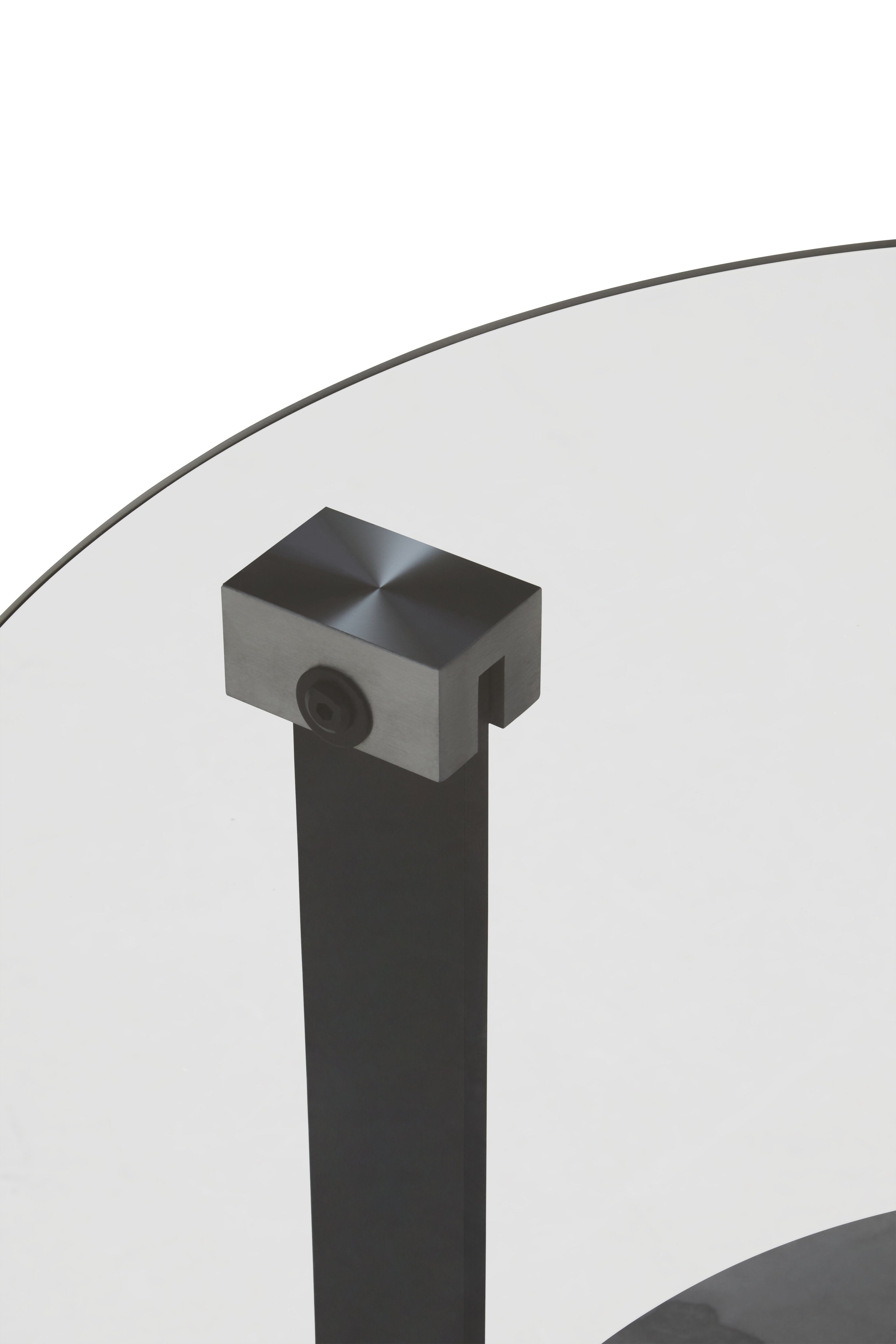 This round coffee table combines a grey glass top with a white ceramic lower shelf, supported by elegant black coated iron legs for a modern look.