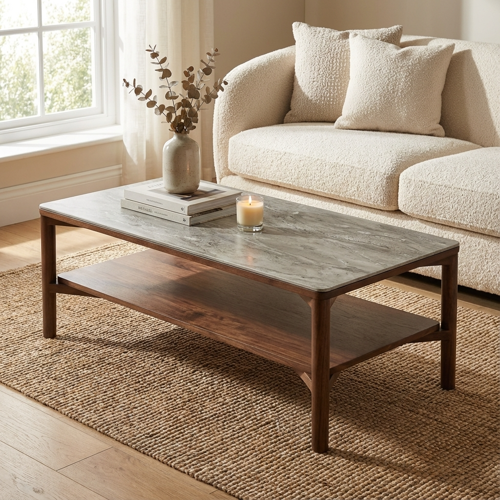 The Willow Coffee Table with Shelves is a signature piece in any living room with its tobacco walnut finish and marbled glass beige top will give your living room a stylish and modern look.